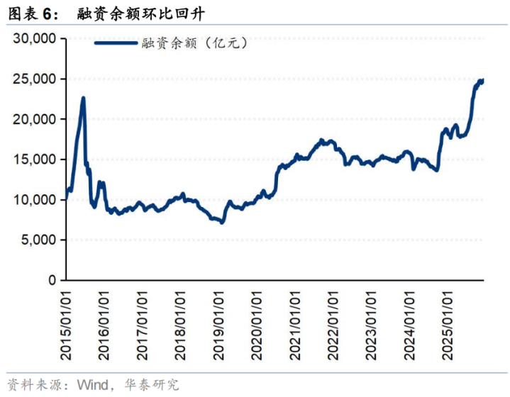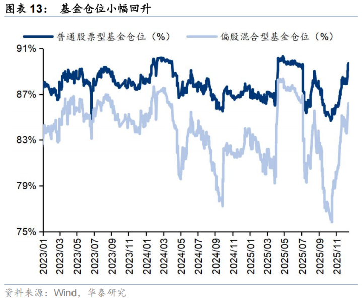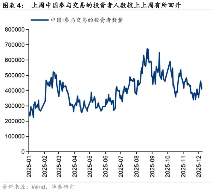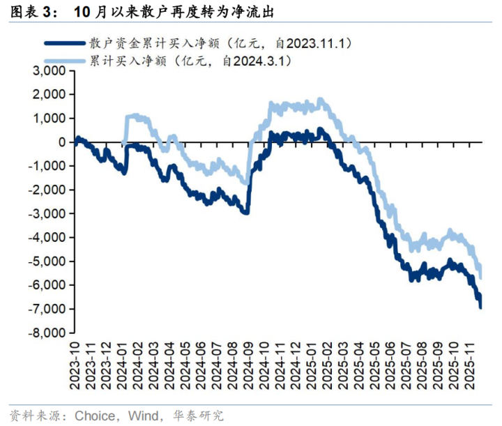 散户资金上周净流出463亿元。(1)数量角度,11月新增开户数238万户,环比2025年10月有所回升;(2)流量角度,2025年8月中旬以来,散户资金净流入;(3)方向角度,上周散户资金净流入通信、电子、非银金融等行业,净流出基础化工、医药生物、机械设备等方向。