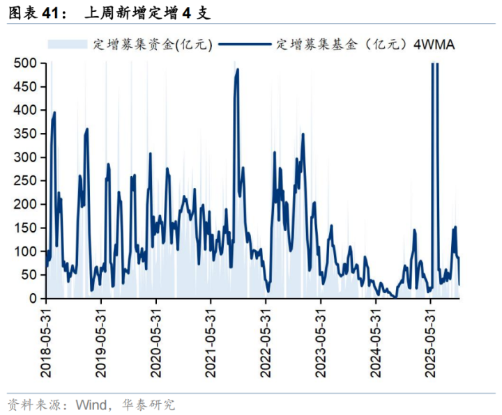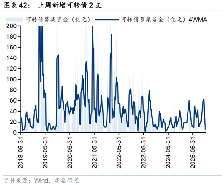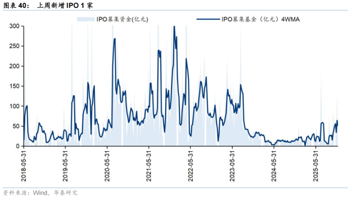 上周一级市场募资金额环比回落。上周新增IPO1家,首发募集资金12.7亿元;上周新增定增4支,募资13.4亿元,新增可转债2支,募资15.6亿元。