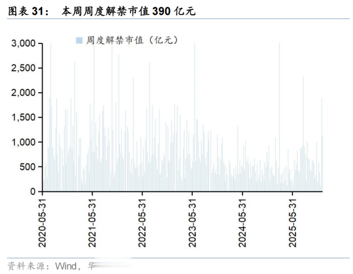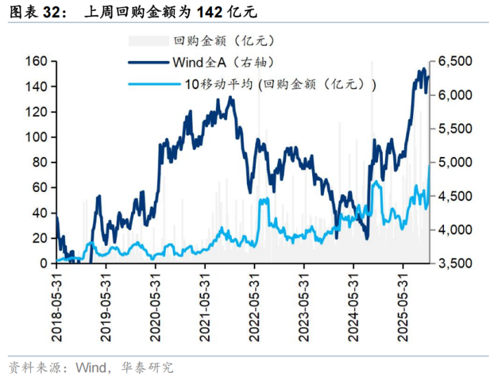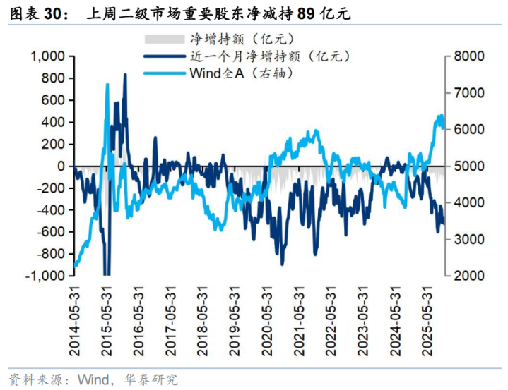 上周二级市场重要股东净减持89亿元。解禁市值方面,本周解禁市值为390亿元,供给端压力环比回落。回购方面,上周二级市场股票回购金额142亿元,回购预案金额为26亿元,回购金额环比上上周小幅回落。