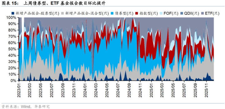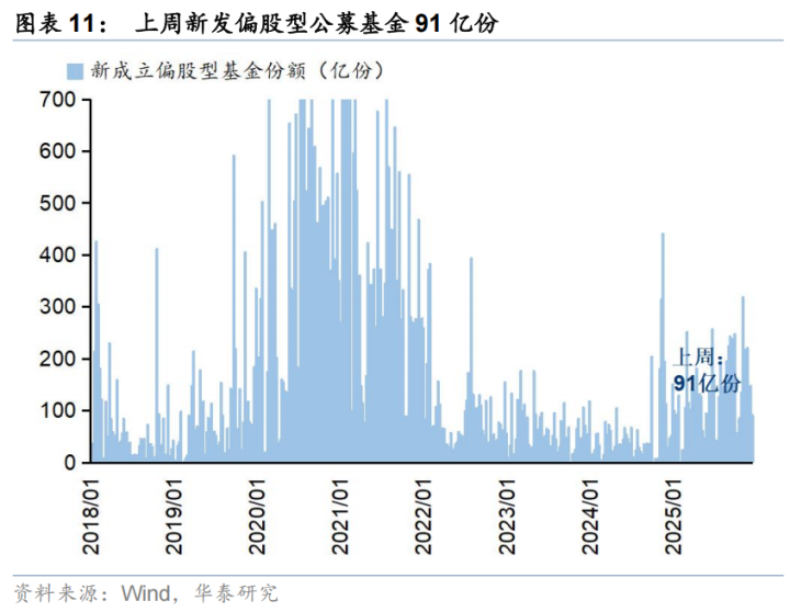 上周新成立偏股型基金91亿份,新发强度环比小幅回落,存量基金中,股票/混合基金权益仓位环比小幅回升。