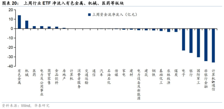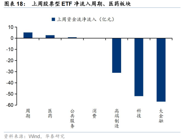 上周股票型ETF净申购278亿份,净流出24亿元,其中宽基ETF净流入83亿元,已连续净流入两周。分板块来看,周期、医药板块净流入规模居前,行业中有色金属、机械、医药、电力及公用事业等行业净流入居前。