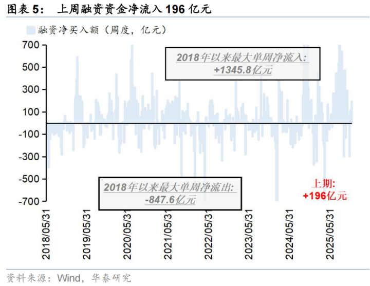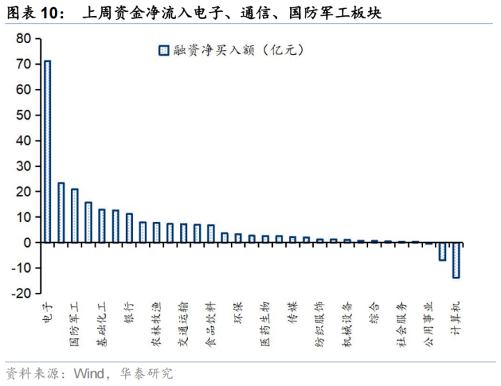 杠杆资金:上周融资资金流入196亿元,活跃度为10.2%,结构上,融资资金流入电子、通信、军工等板块,净流出计算机、汽车等板块;