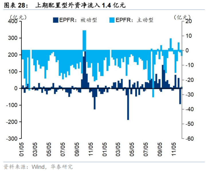外资:以EPFR统计的外资中,12月5日-12月11日,配置型外资净流入1.4亿元,其中主动配置型外资持续流出3.2亿元,被动配置型外资净流入4.6亿元;