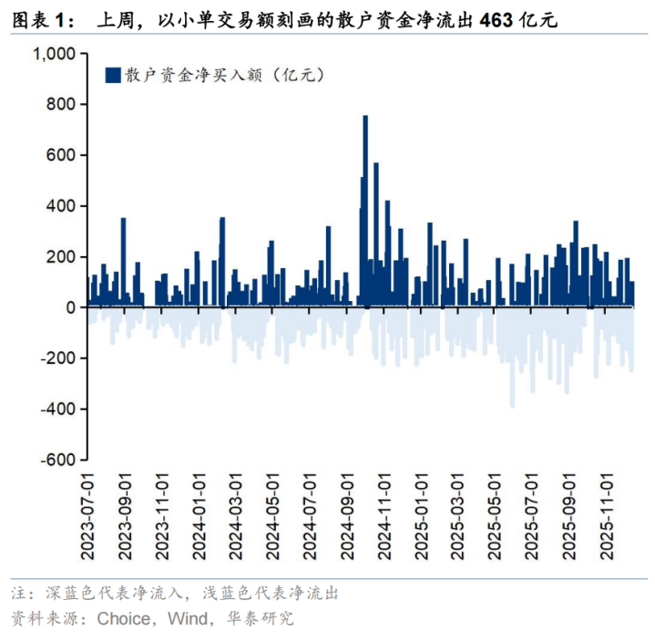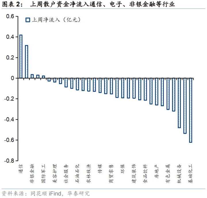 散户资金:上周散户资金(以小单交易金额刻画,后同)净流出463亿元,净流入通信、电子、非银金融等行业,净流出化工、医药、机械设备等方向;