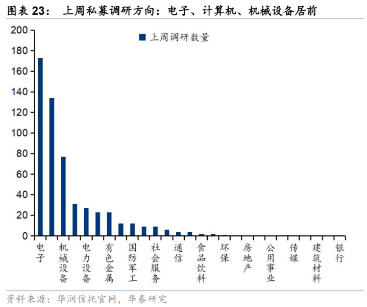 私募:上周,私募证券备案数量342支,备案数量环比回升且创下年内新高;调研方面,上周电子、计算机、机械设备等板块私募调研数目居前。