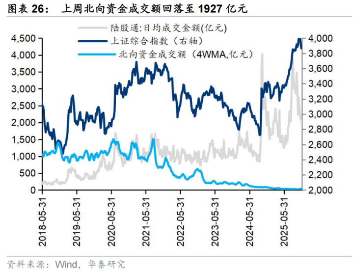 上周北向资金日均交易额回落至1927亿元。以EPFR统计的配置型外资中,12月5日-12月11日,配置型外资净流入1.4亿元,其中主动配置型外资持续流出3.2亿元,被动配置型外资净流入4.6亿元。